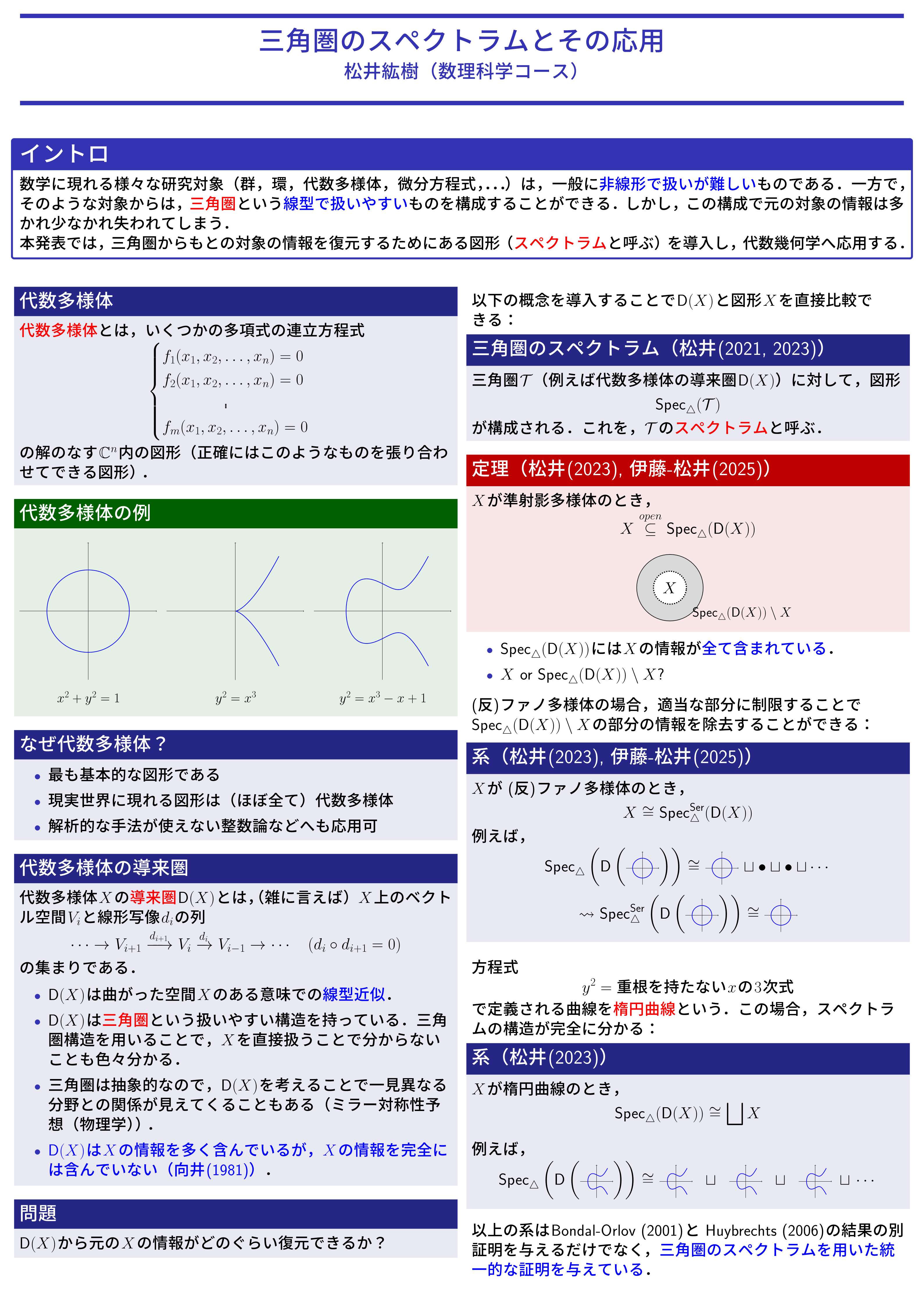 数学の様々な分野に自然に現れる三角圏に対してスペクトラムと呼ばれる幾何学的な対象を導入し、三角圏の幾何学を展開する