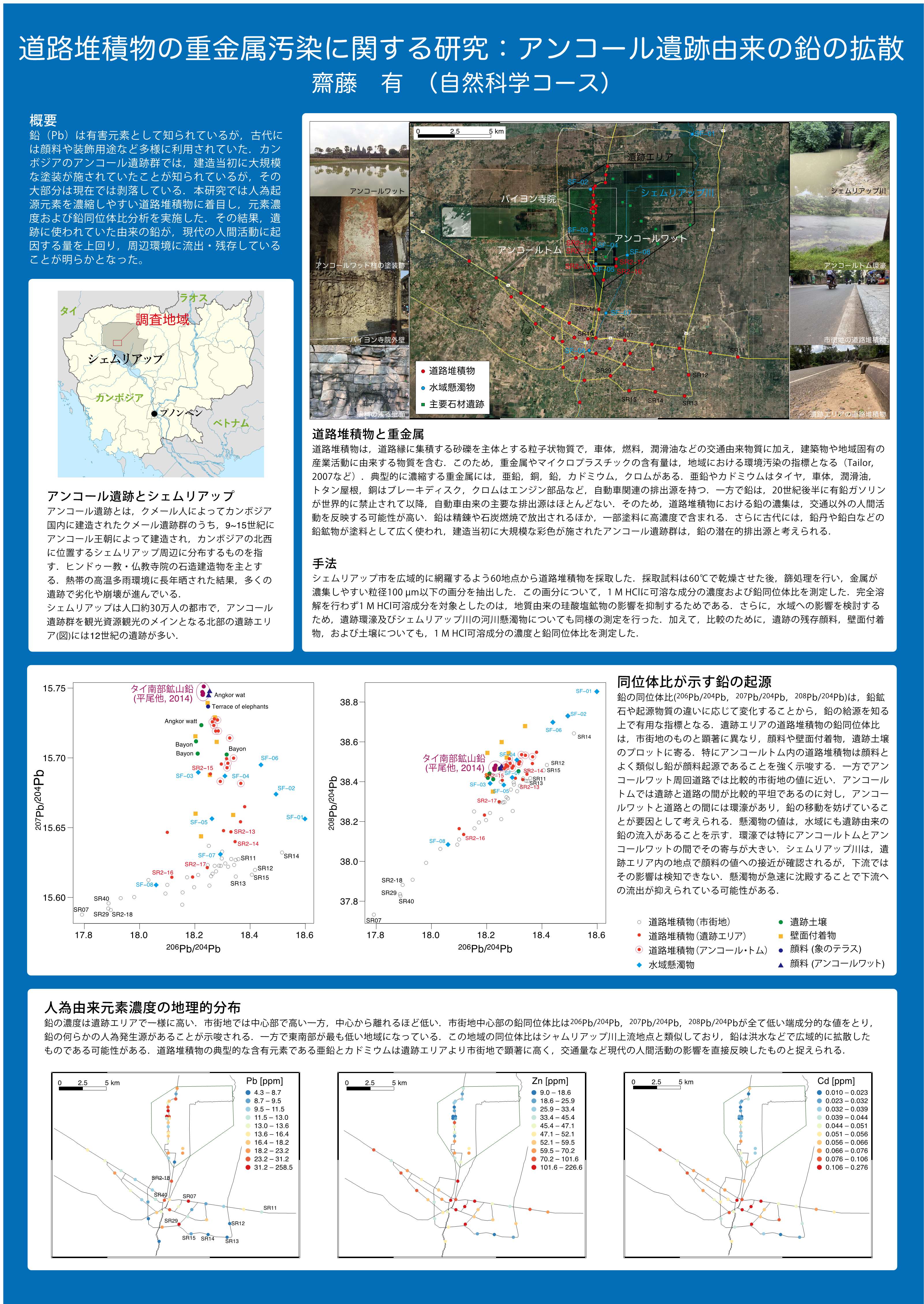アンコール遺跡周辺の道路堆積物に遺跡由来の鉛が高濃度で含まれていることを報告する