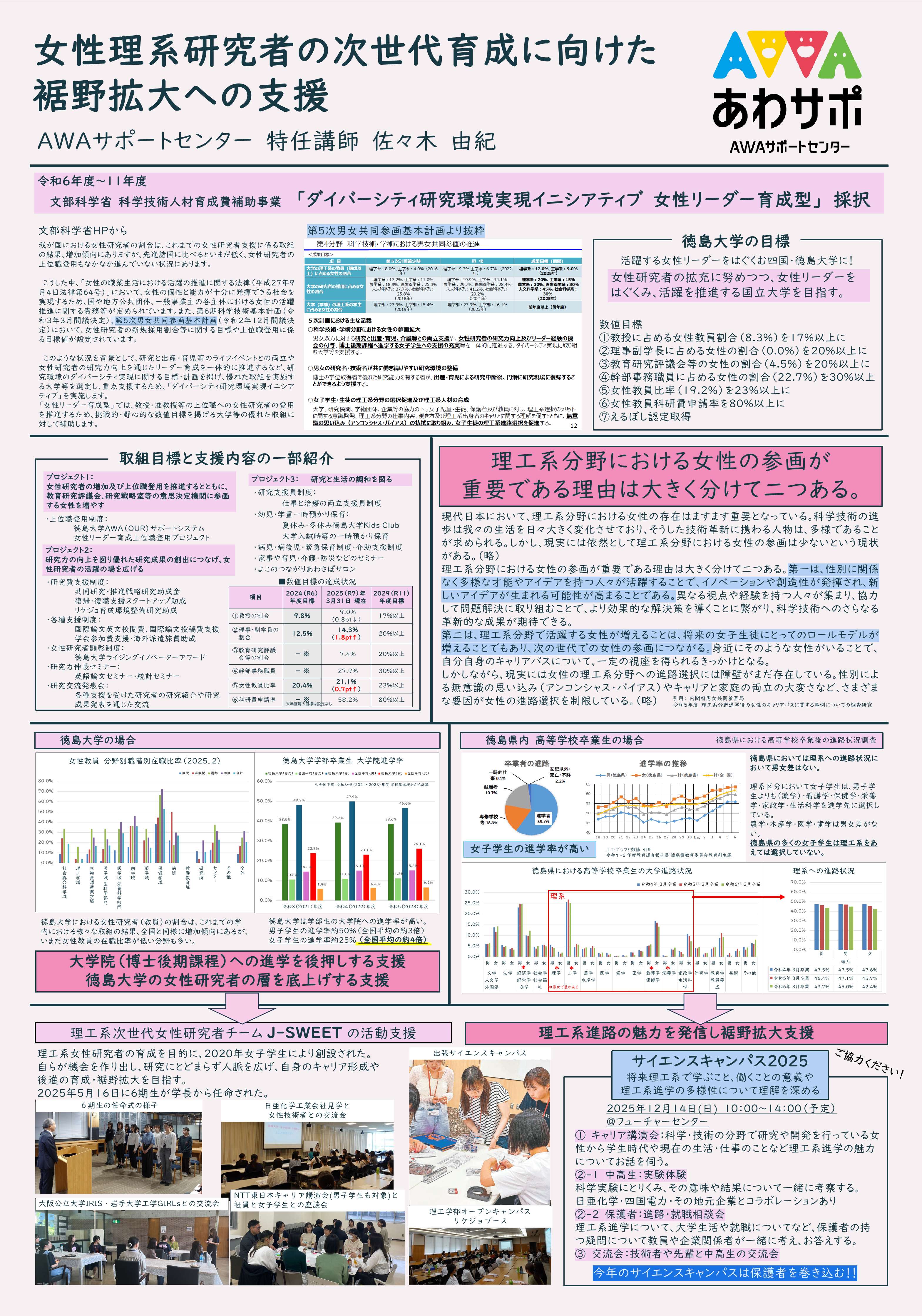 理工系女子学生への活動支援や、女子中高生の理系進学選択を後押しする裾野拡大事業について紹介する