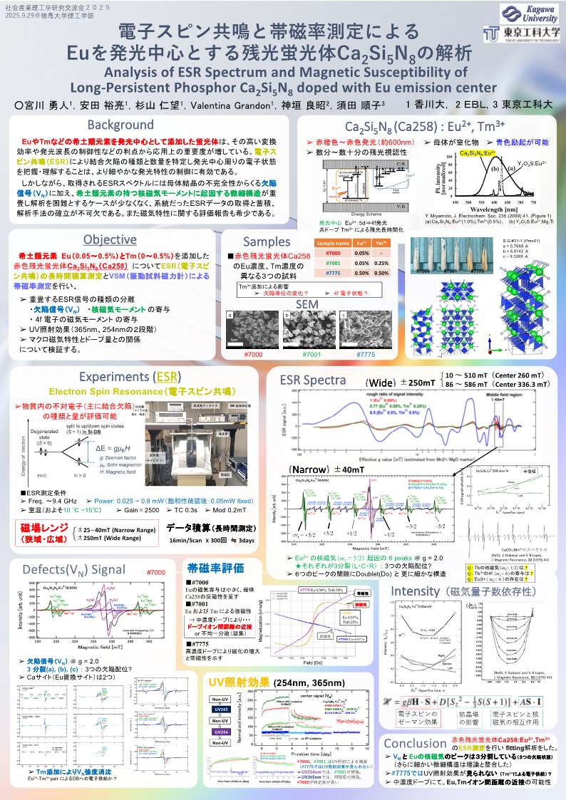 赤色残光蛍光体Ca2Si5N8へ希土類元素を添加し、電子スピン共鳴と帯磁率の変化を調べた